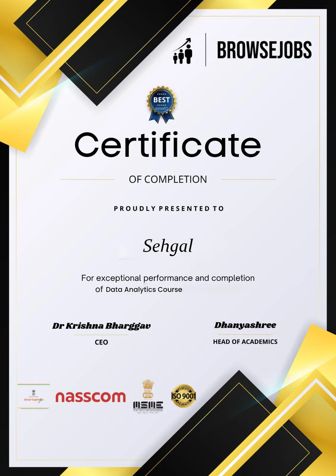 BrowseJobs provides you the Data Analytics Certification after the successful completion of the course as a testimony to the skills, knowledge and expertise you have acquired within the duration of the course.